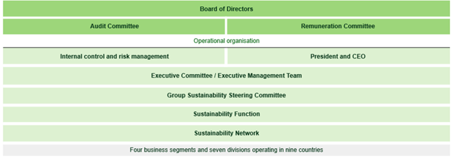 At Assemblin Caverion Group, the Board of Directors is responsible for overseeing the sustainability matters. Operational sustainability matters are delegated to the CEO, the Executive Management Team, the Group Sustainability function and senior managers across the divisions. In order to work in an efficient way, Assemblin Caverion Group has established a group-wide Sustainability Steering Committee as well as a Sustainability Network.